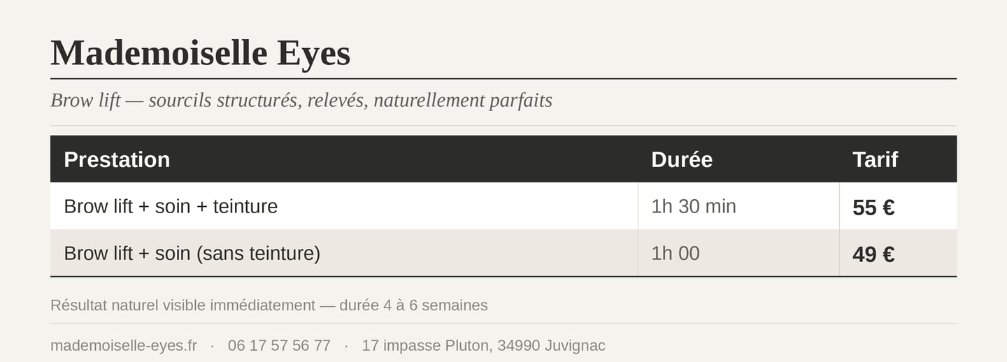 Les poils sont redressés, laminés et fixés dans la direction idéale pour votre morphologie, ouvrant le regard et donnant aux sourcils un volume et une définition remarquables.